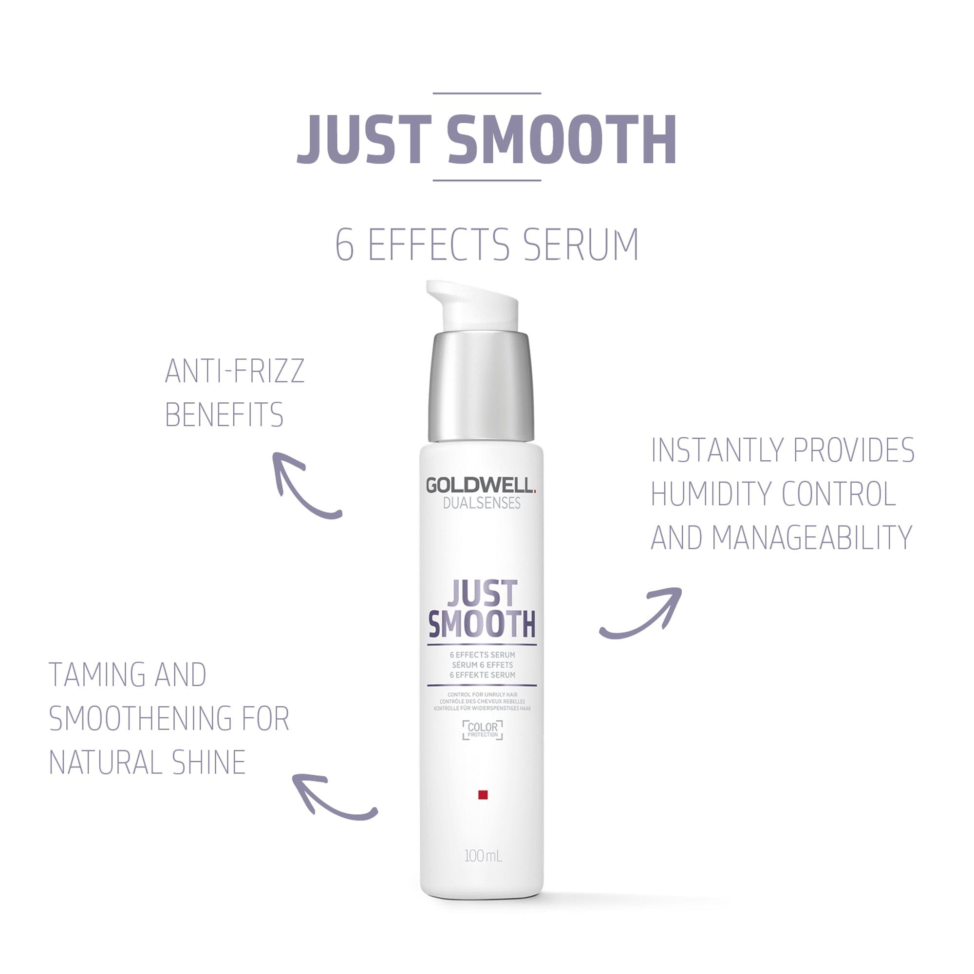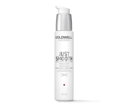 Goldwell Dualsenses Just Smooth 6 Effects Serum 100ml provides instant control for unruly hair, delivering six smoothening effects for anti-frizz, humidity control, taming, manageability, smoothening, and natural shine.
