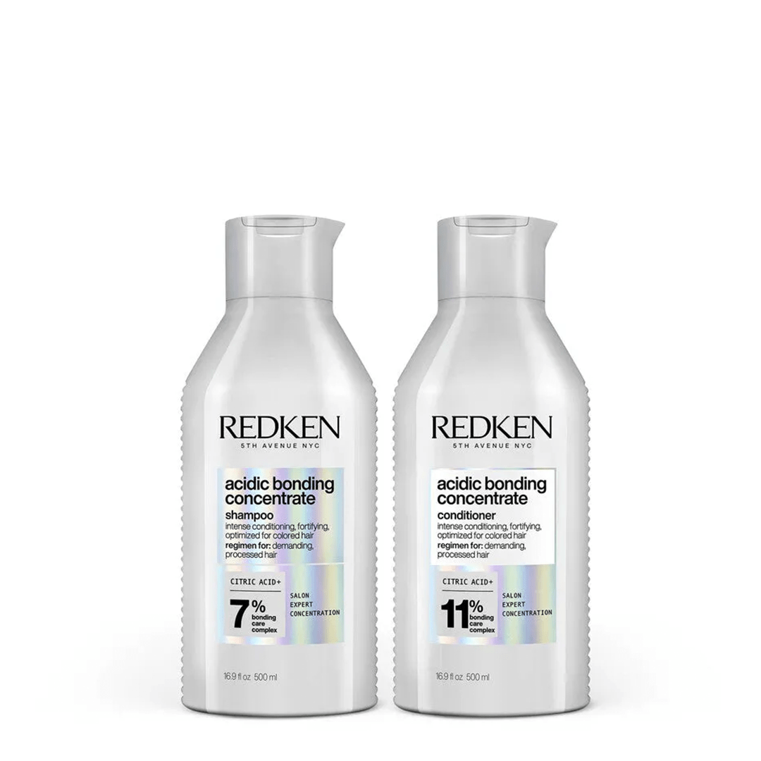 This Redken Acidic Bonding Concentrate Shampoo and Conditioner 500ml Bundle includes a 500ml bottle of Redken Acidic Bonding Concentrate Shampoo and a 500ml bottle of Redken Acidic Bonding Concentrate Conditioner, designed to strengthen and repair damaged hair.