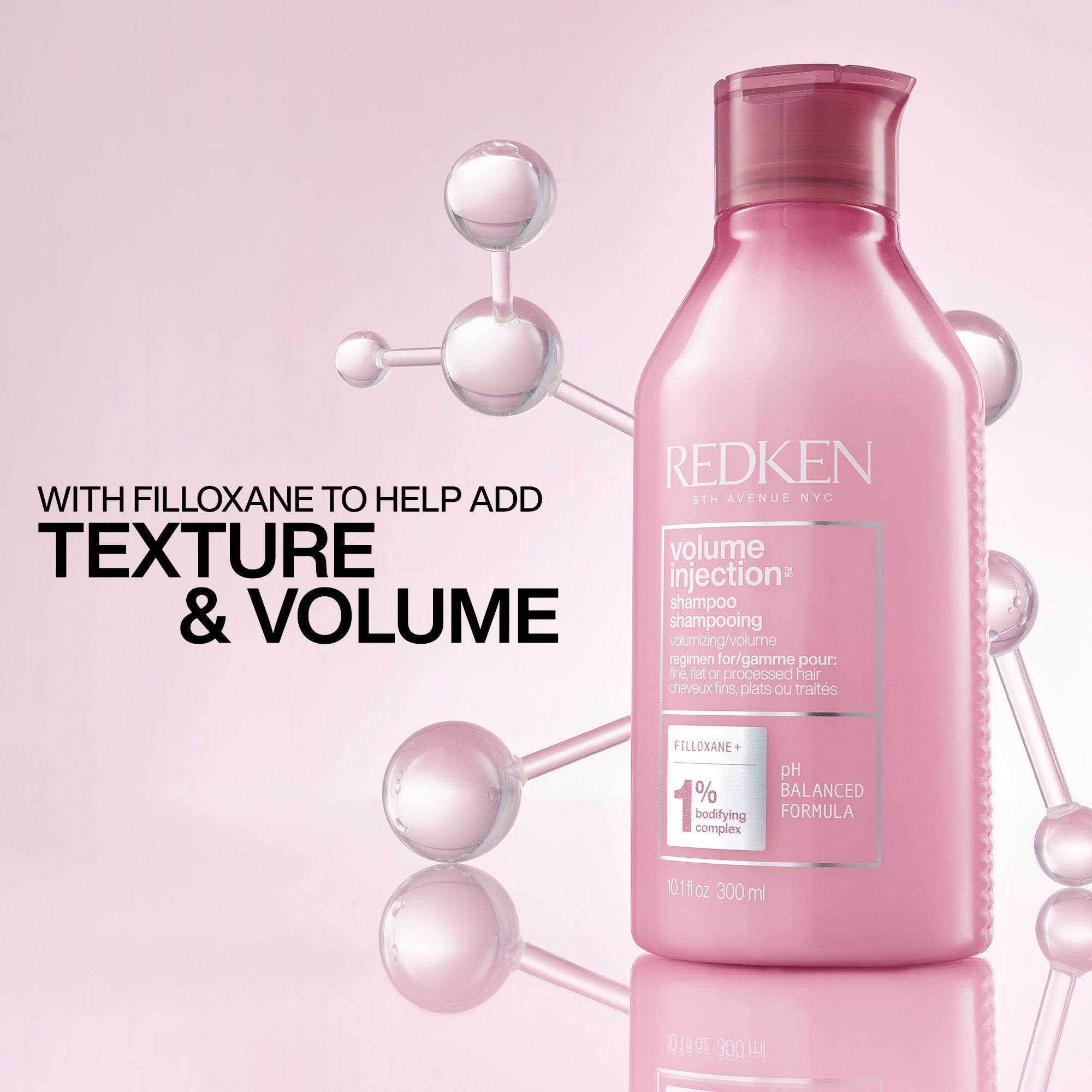 Redken Volume Injection Shampoo adds instant volume, gently cleanses, lifts hair, and nourishes scalp. Ideal for fine, flat, or processed hair.